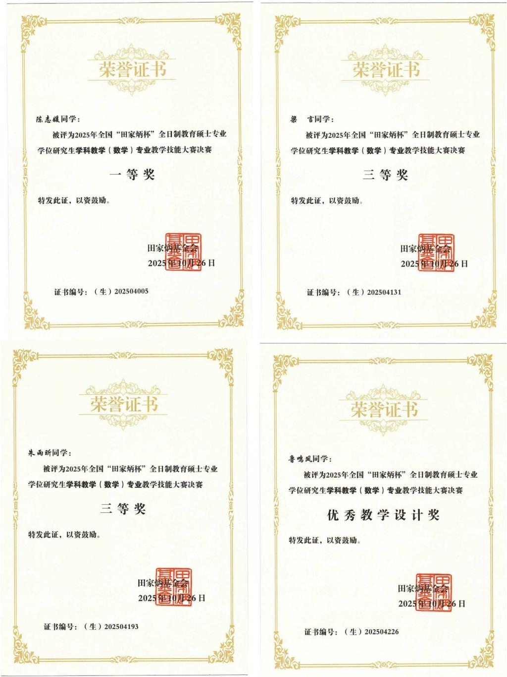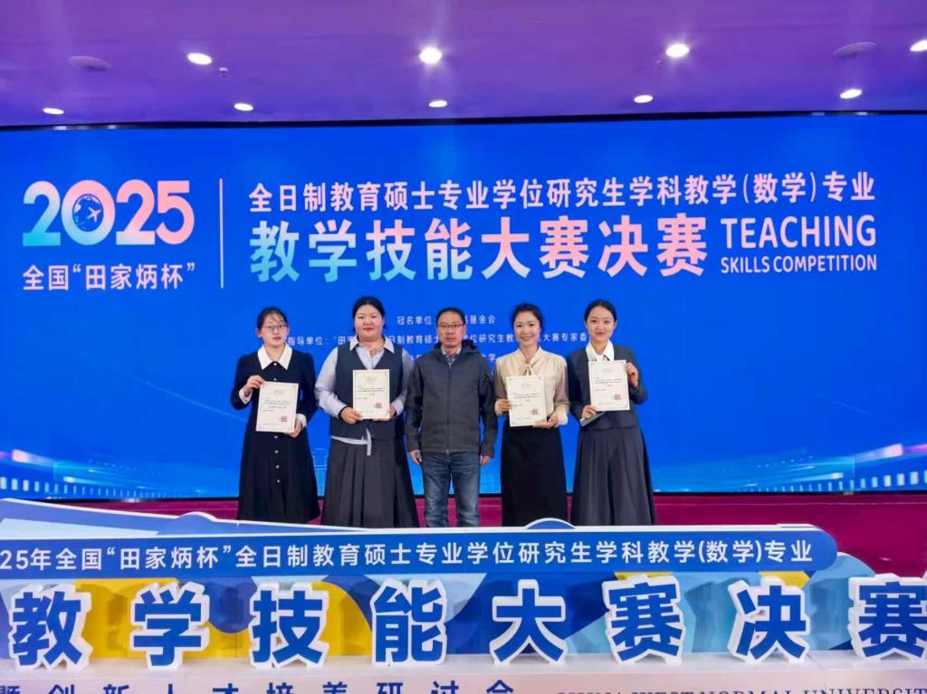 近日,2025年全国“田家炳杯”全日制教育硕士专业学位研究生学科教学(数学)专业教学技能大赛决赛在西华师范大学举行。经过激烈角逐,开元官网开元集团网站学科教学(数学)专业研究生陈志媛获一等奖,梁言、朱雨昕获三等奖,鲁鸣凤获优秀教学设计奖,开元集团网站教师彭燕伟博士获“优秀指导教师”奖。