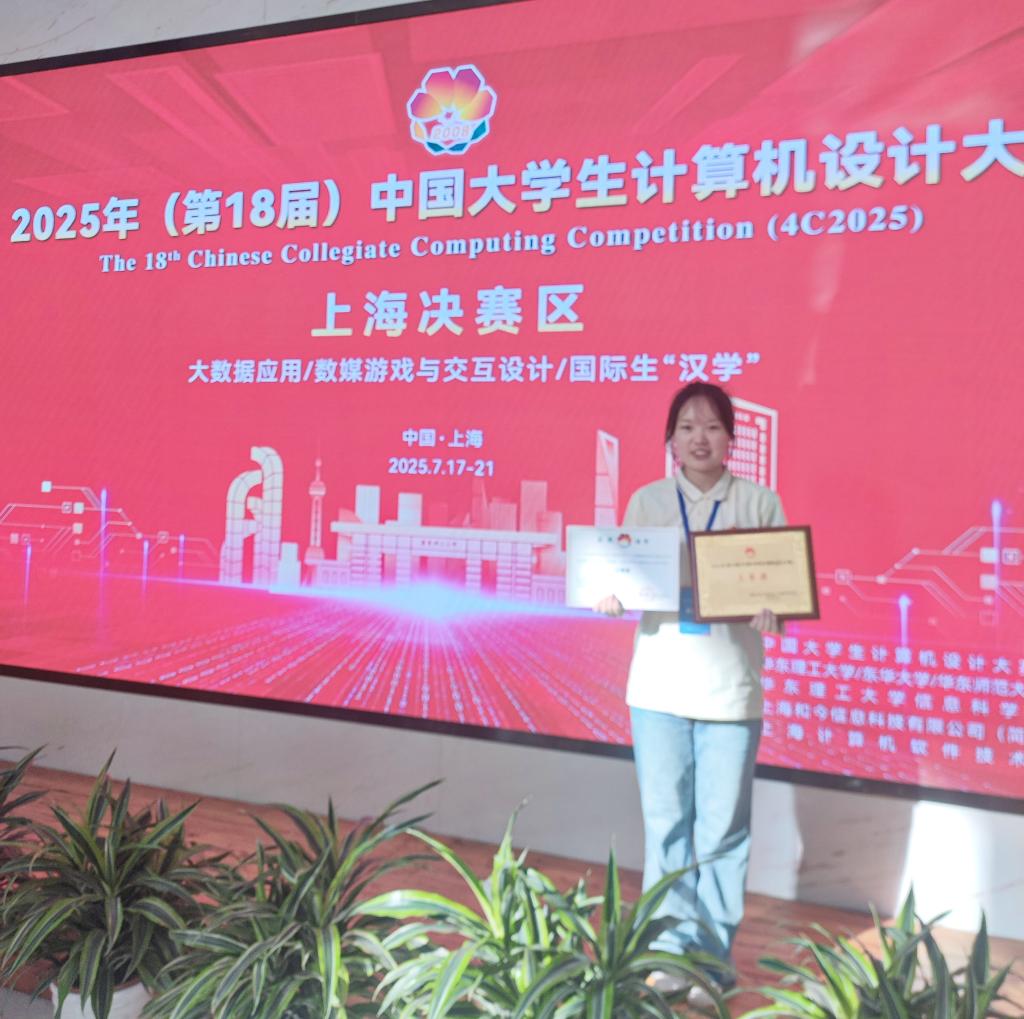 7月21日,2025年(第18届)中国大学生计算机设计大赛全国总决赛在上海华东理工大学圆满举行,本次赛事吸引全国500余支队伍同台竞技,经过紧张激烈的角逐,开元集团网站刘倩茹和机电与汽车工程学院林欣2名同学组成的团队,凭借作品《数览天水—大数据驱动的古城沉浸式导览系统》脱颖而出。在决赛现场,刘倩茹同学代表团队进行项目路演与答辩,通过出色的视觉呈现、清晰的方案阐述与自信的答辩互动,全面展示了该作品的创新价值与社会效益,在大数据应用赛道中荣获全国三等奖。