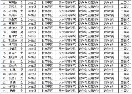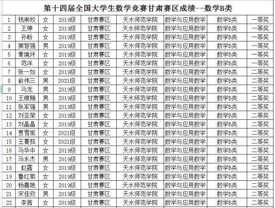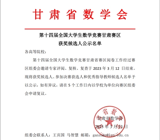 由中国数学会主办的2023年第十四届全国大学生数学竞赛(甘肃赛区)获奖名单近日揭晓。开元官网有62名同学喜获佳绩。数学专业B组获奖44项,其中一等奖6项,二等奖19项,三等奖19项;非数学专业获一等奖1项,二等奖4项,三等奖13项,共18项。数统学院2019级学生钱崇姣获数学专业B组第三名,机电学院2021级学生邓义强获非数学专业第7名,两人将代表甘肃赛区参加全国大学生数学竞赛决赛。