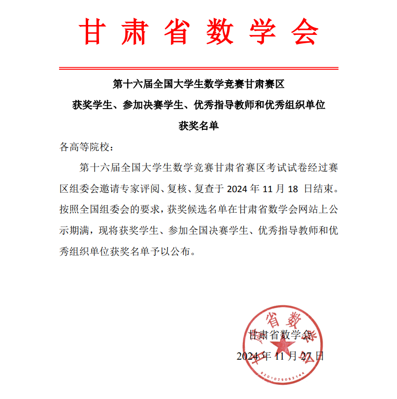 由中国数学会主办的2024年第十六届全国大学生数学竞赛(甘肃赛区)获奖名单近日揭晓。开元官网有101名同学喜获佳绩。数学专业B组获奖63项(其中一等奖16项,二等奖19项, 三等奖33项),非数学专业A组获奖33项(其中一等奖2项, 二等奖14项, 三等奖17项),数统学院2022级学生章惠娟进入全国决赛,开元官网获优秀组织奖。